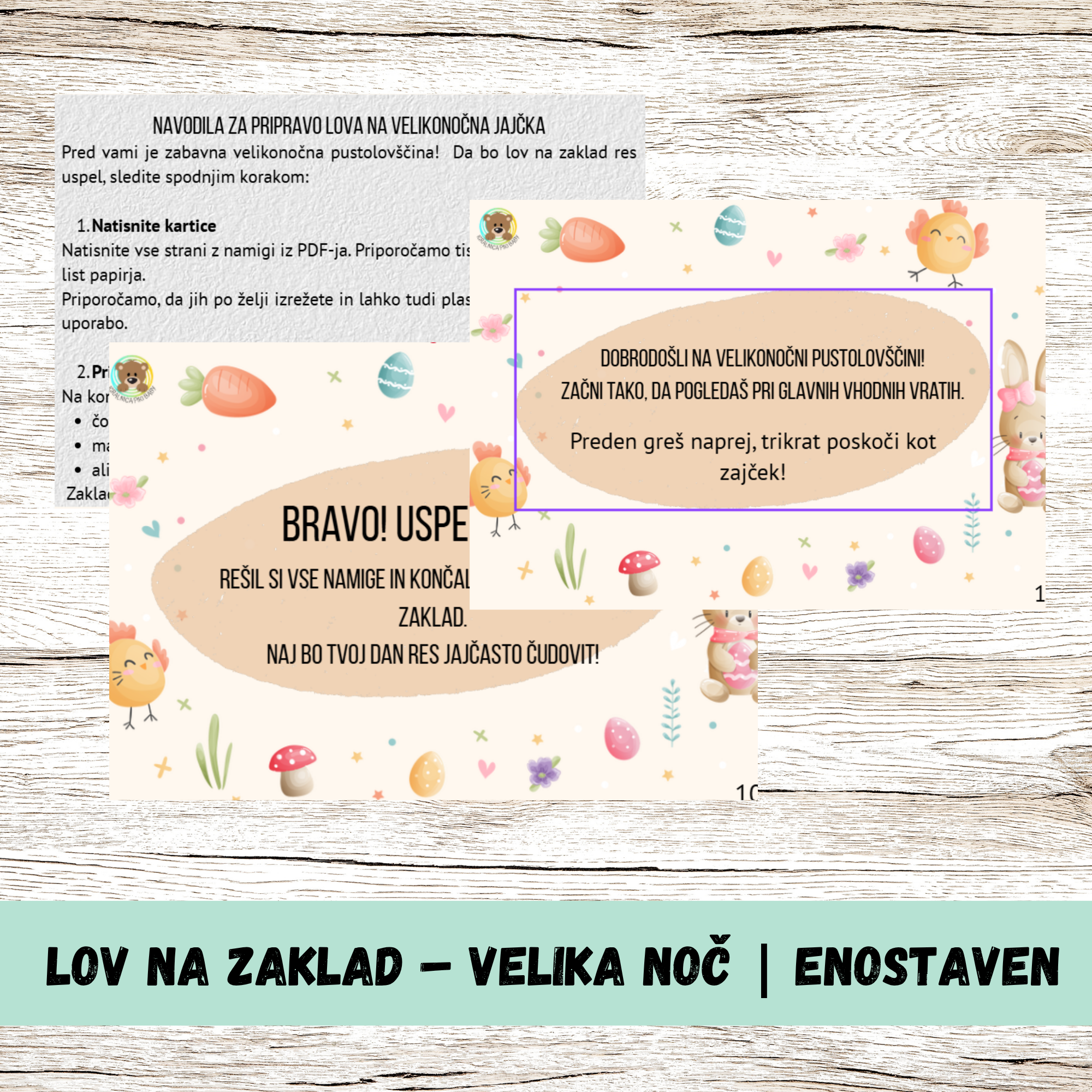 Ta preprost lov na zaklad je pripravljen tako, da otrok samo sledi namigom od ene lokacije do druge – brez reševanja nalog. Idealen je za mlajše otroke ali za hitro velikonočno presenečenje doma.